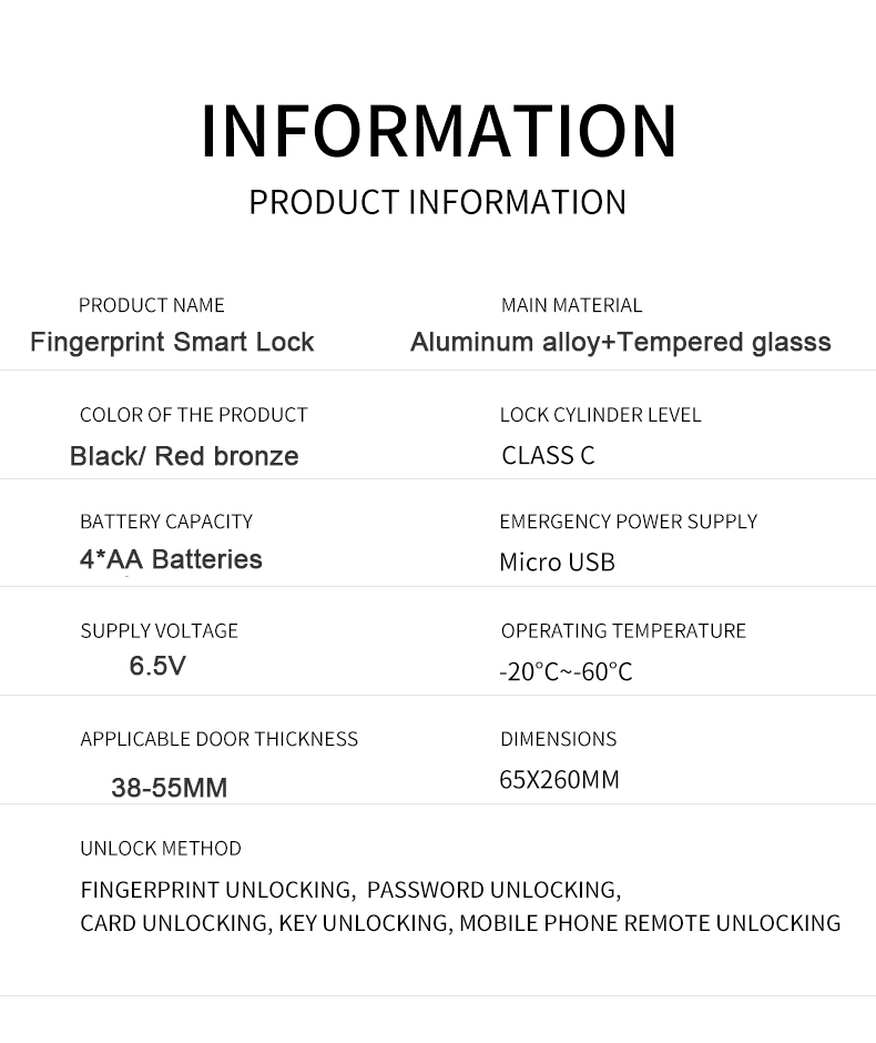 • Multiple unlocking methods: PIN code, fingerprint, access card, mobile app