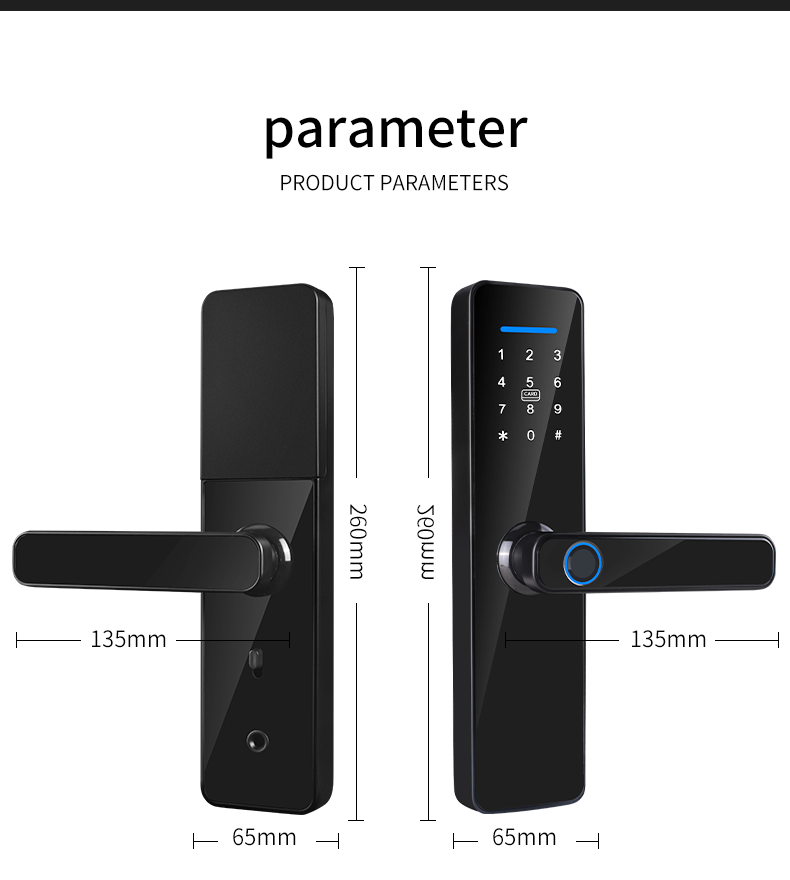 Keamanan & Manajemen:Alarm anti-congkel/pembukaan paksa, penguncian kesalahan kata sandi, pengingat pintu terbuka/tidak terkunci, penguncian otomatis, penyimpanan cloud/lokal catatan pembukaan kunci; model komersial mendukung izin hierarkis dan laporan kehadiran.