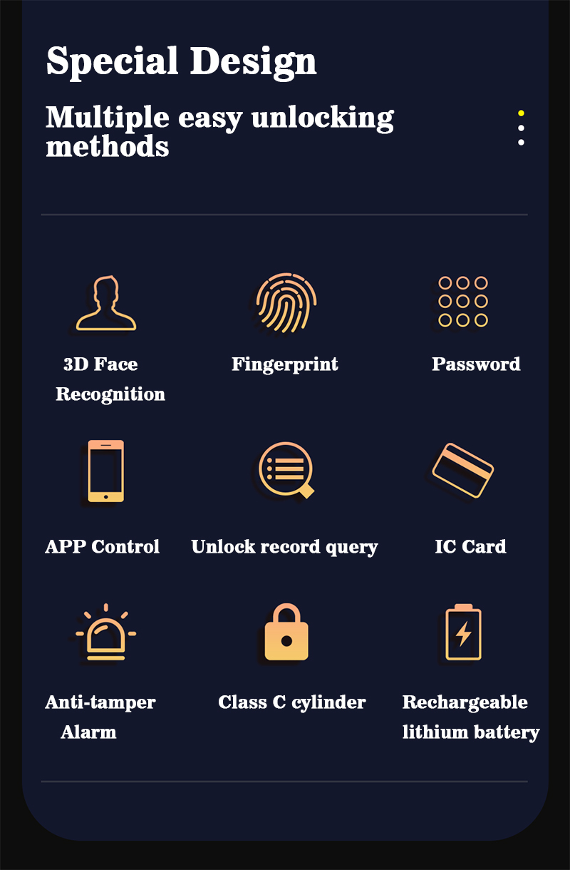 | Metode Unlock | Aplikasi WiFi Tuya, Kata Sandi, Sidik Jari, Kartu, Kunci |