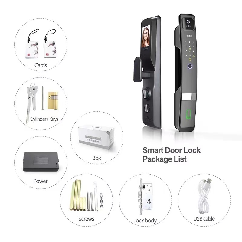 Kunci pintu cerdas paduan aluminium canggih dengan pengenalan wajah 3D, pemindaian sidik jari, dan beberapa metode akses dengan konektivitas Tuya WiFi untuk remote control.